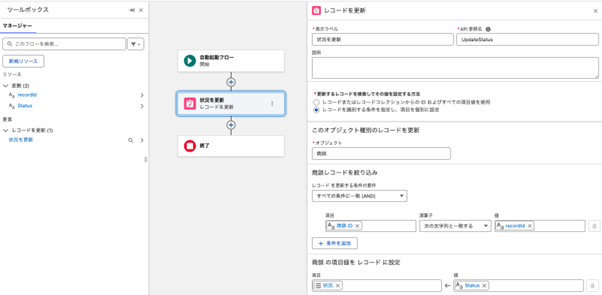 - 事前に用意した状況を更新するフローを選択し、入力値、状況の値を設定