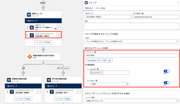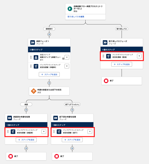 - 同様に各フェーズにも状況を取消、承認済、却下に更新するバックグラウンドステップを追加