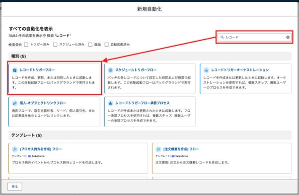 - 検索ボックスに[レコード]と入力し、[レコードトリガーフロー]をクリック