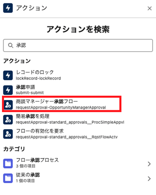 - アクション検索で作成したフロー承認プロセスを検索して選択