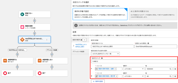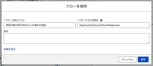 ここでは、割引率が40%を超える商談が作成または更新された場合に自動で承認申請を行い、承認の進行にあわせて商談の状況を更新する例を用いて、フロー承認プロセスの設定方法を説明します。