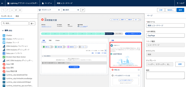 - 商談レコードページの編集画面で[オーケストレーション作業ガイド]、[承認追跡]を画面上に追加し、保存、有効化