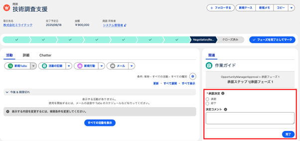 以上の設定により、商談レコードの割引率が40%以上の場合に、自動で承認申請が行われ、承認者は承認または却下の操作を行えるようになります。