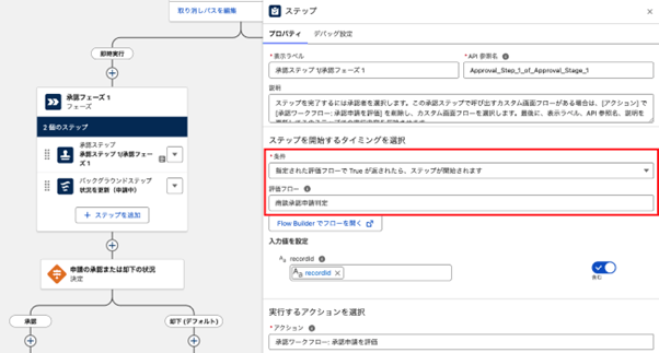 - フロー承認プロセスのステップを開始するタイミングの条件にて[指定された評価フローでTrueが返されたら、ステップが開始されます]を選択し、作成した評価フローを設定