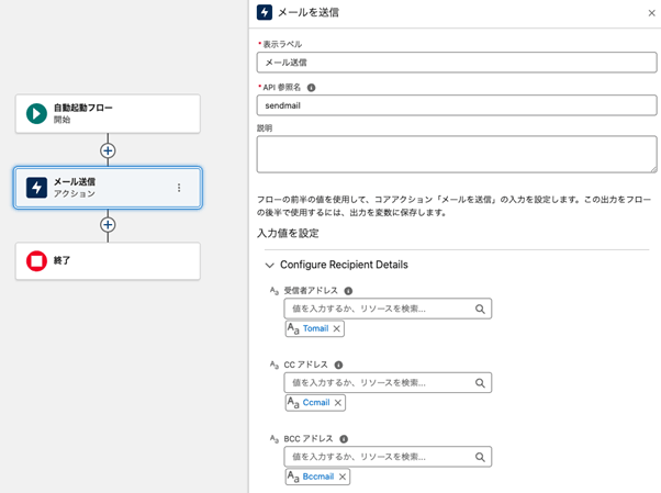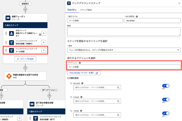 - バックグラウンドステップを追加し、作成したメール送信フローを設定