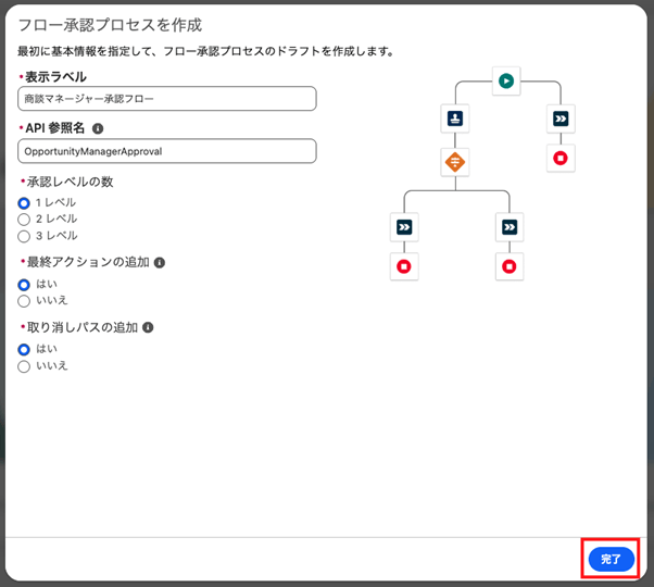 - 表示ラベル、API参照名を入力し、承認レベルの数、最終アクションの有無、取り消しパスの有無を選択して[完了]をクリック