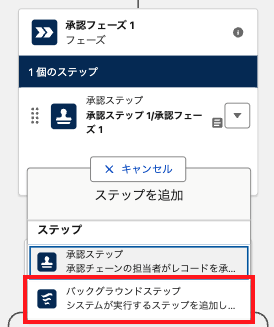 バックグラウンドステップでは、承認の進行に応じた自動処理を設定できます。ここでは状況を自動更新する処理を設定します。