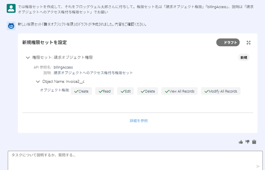 - 権限セット作成を指示するとドラフトを提示してくれます。
