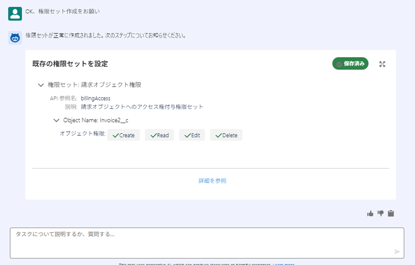 - すべての参照、すべての編集権限は不要な旨を伝えると再び権限セットのドラフトを提示してくれるので、OKの旨を伝えると実際に権限セット作成が完了しました。