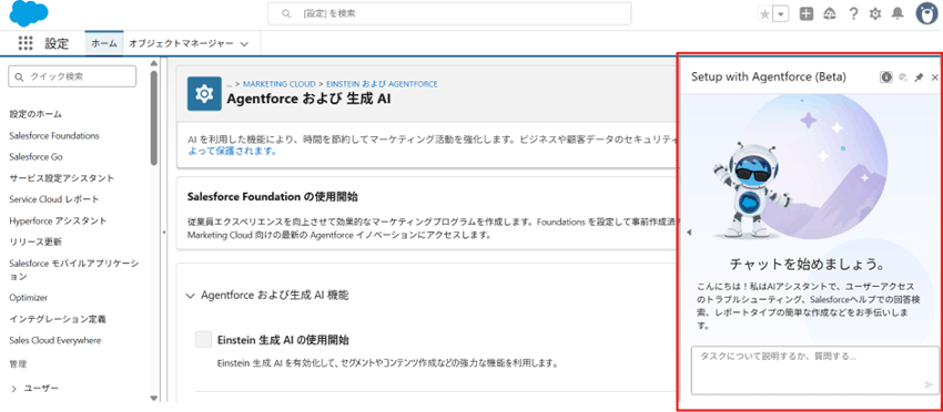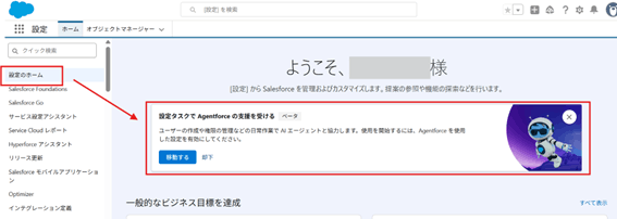 - [設定のホーム] – [設定タスクでAgentforceの支援を受ける]