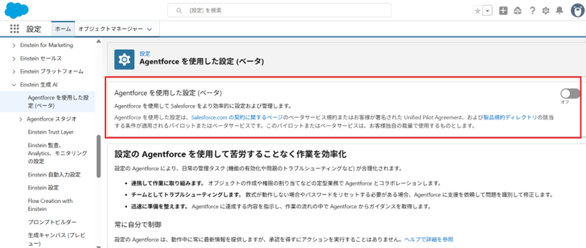 遷移先のページで「Agentforceを使用した設定(ベータ)」を有効化します。