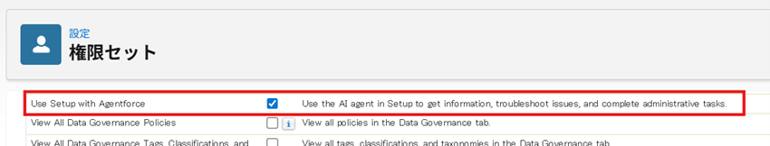 [権限セット] – [システム権限]セクション – [Use Setup with Agentforce]