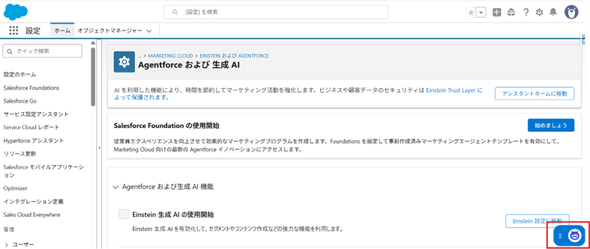 ① 設定の各画面上で画面右下にAgentforceマークが表示されるようになりました。