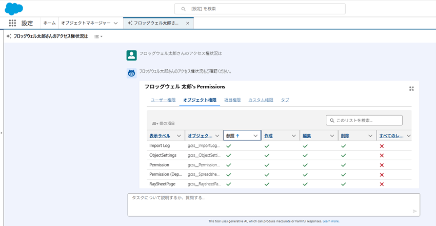 Salesforceユーザである「フロッグウェル太郎」さんのアクセス権状況を聞いてみると、ユーザページで「概要を表示」ボタンから確認できるのと同様のタブ構成で教えてくれました。