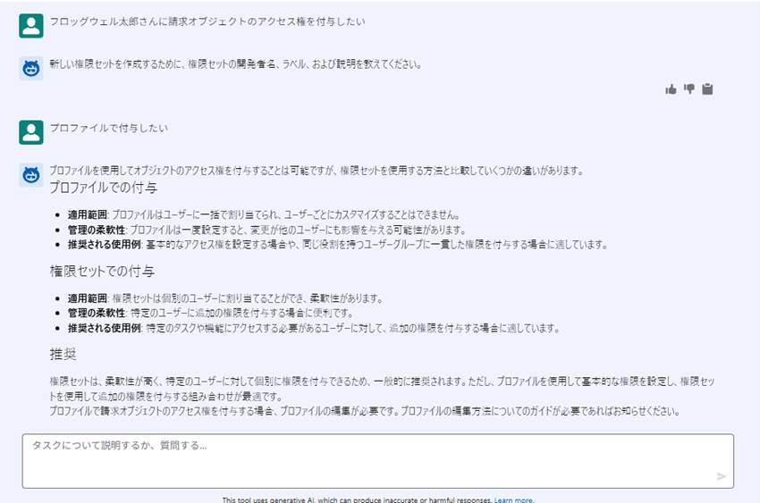 権限セットを提案されたのでプロファイルでの付与をしたいと伝えると、プロファイルと権限セットそれぞれの使い分けと推奨を提示してくれました。