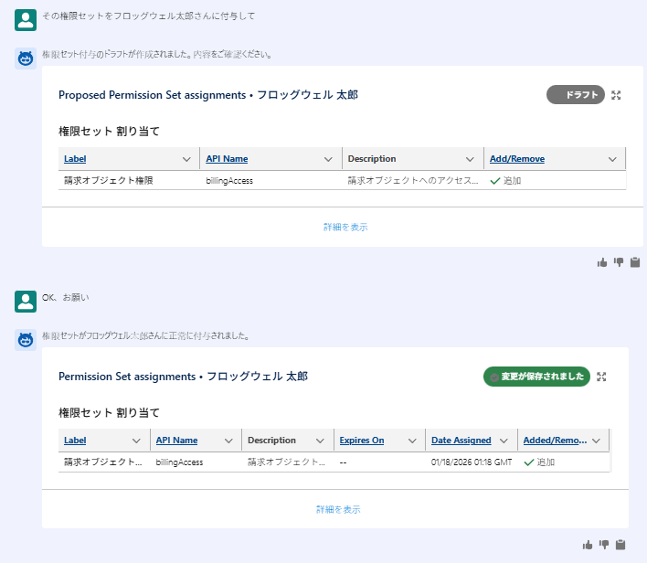 - フロッグウェル太郎さんに付与してほしい旨を伝えると、実際にユーザへの権限セット付与が完了しました。