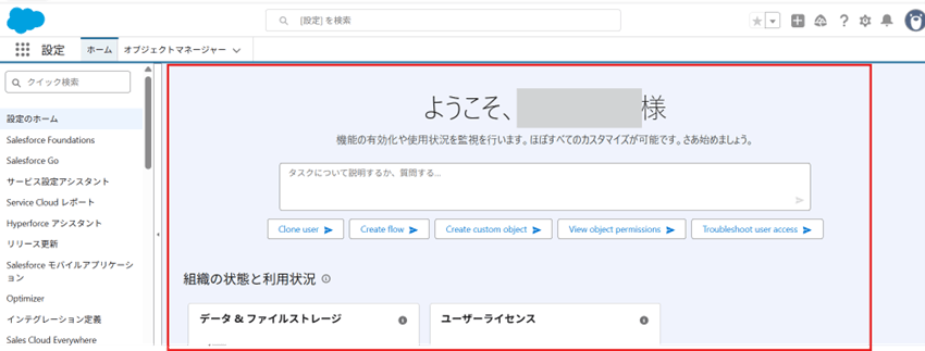 - [設定のホーム] – [設定タスクでAgentforceの支援を受ける]