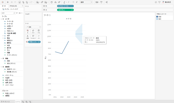Tableauは単なるグラフ作成ツールではありません。 予測や傾向分析などの過去の延長線を見るための機能が標準で組み込まれています。[1.1]