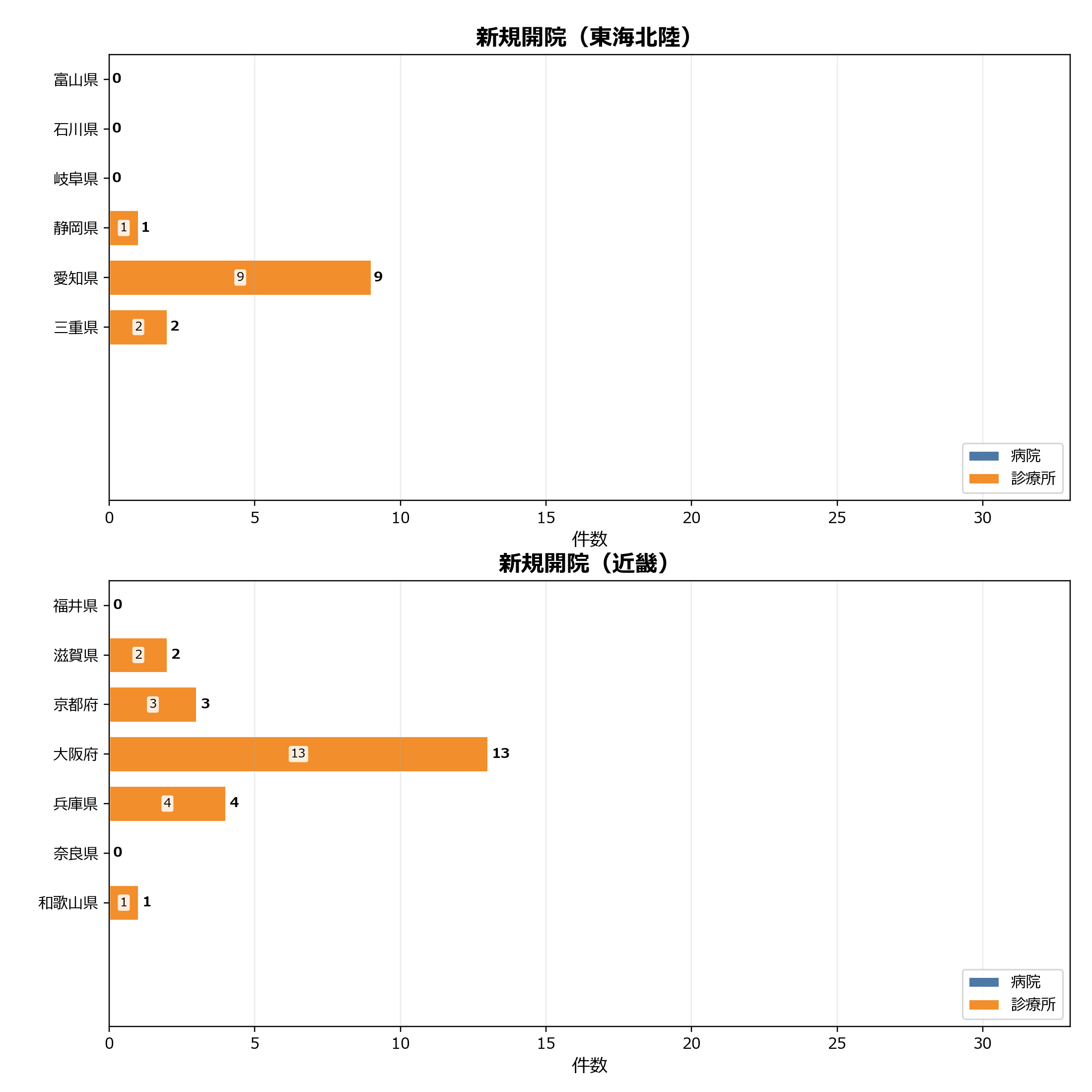 当月は、診療所だけでなく病院の新規開院や区分変更が確認された点が注目されます。