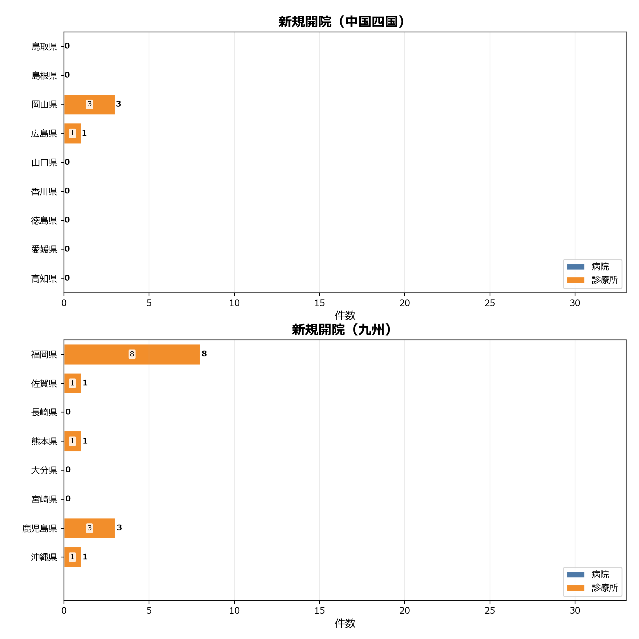 このグラフは、当月に新たに開院した医療機関を都道府県別および施設種別(病院・診療所)で整理したものです。都道府県ごとの件数分布や施設種別の内訳を見ることで、開院動向の地域的な偏りや、病院と診療所の構成差を把握できます。