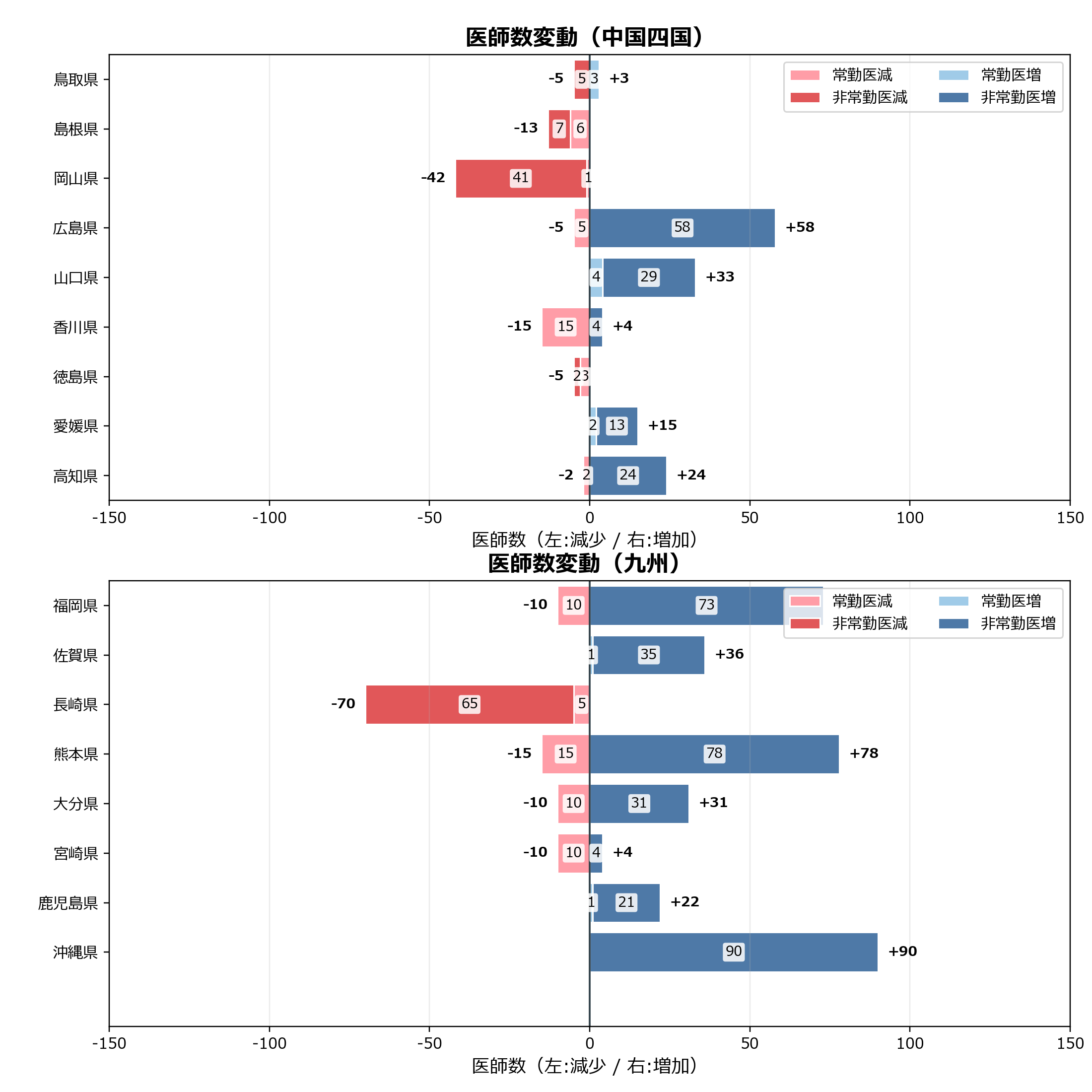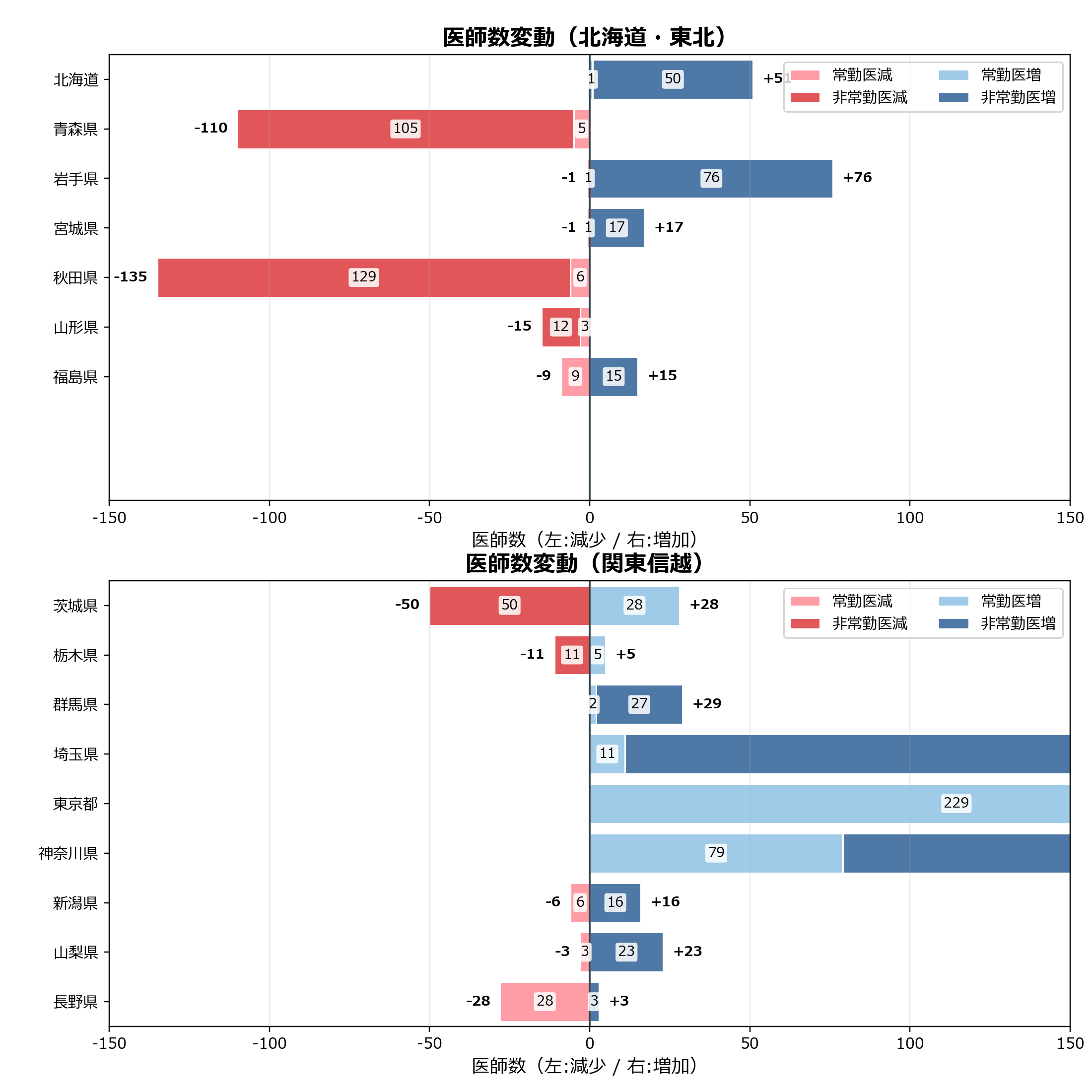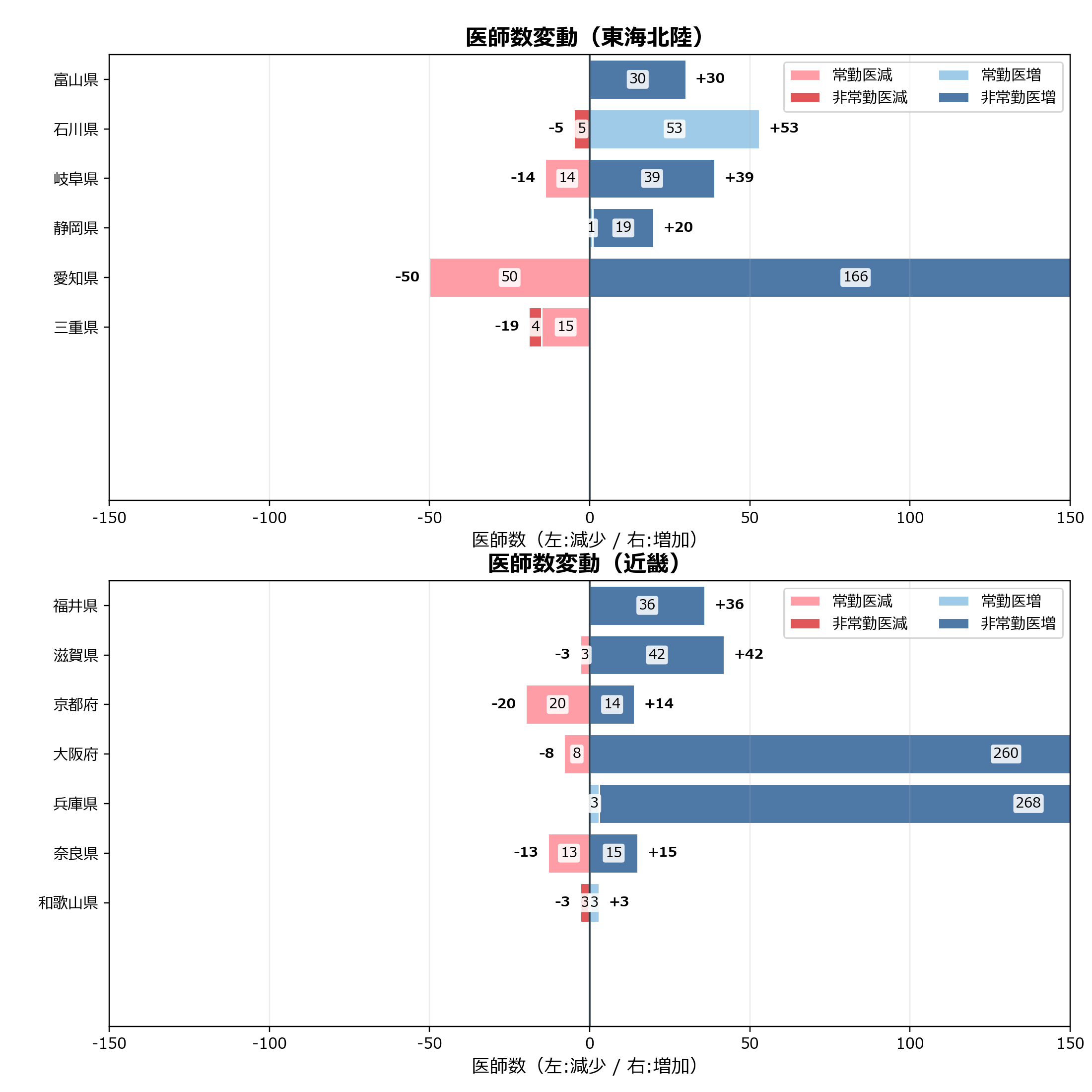 このグラフは、医科データに基づき、勤務医数の増減を都道府県別に整理したものです。常勤医と非常勤医に分けて表示することで、増加・減少の分布や勤務形態の違いによる変動の特徴を読み取ることができます。