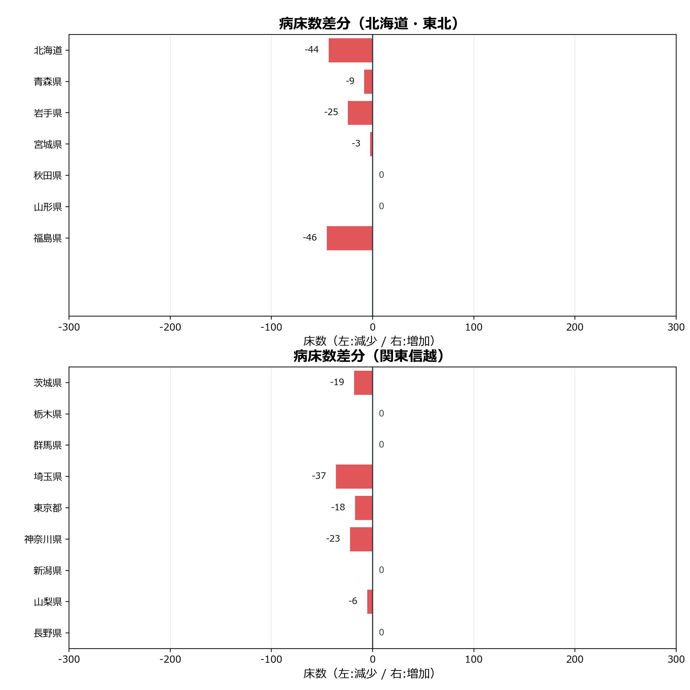 このグラフは、当月の病床数の増減を病床区分別および都道府県別に整理したものです。病床区分ごとの増減や地域別の差分を見ることで、医療機能の再編や地域差の傾向を把握できます。