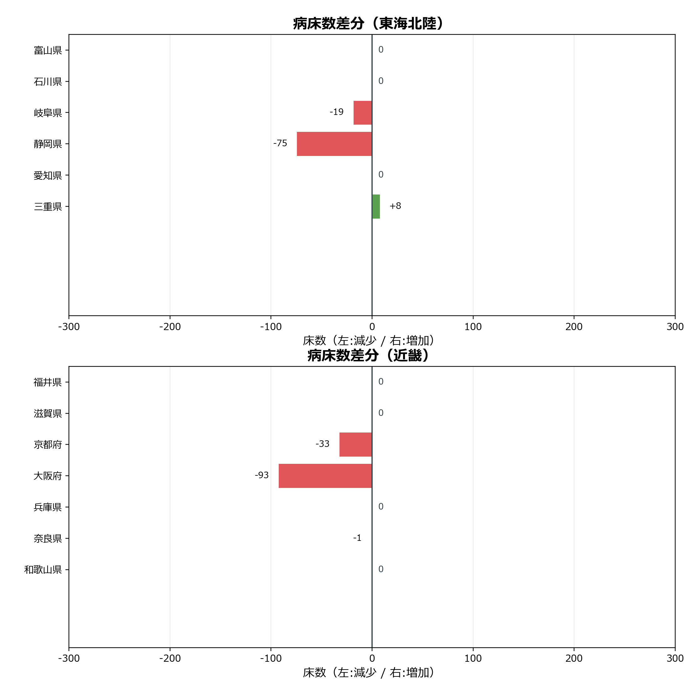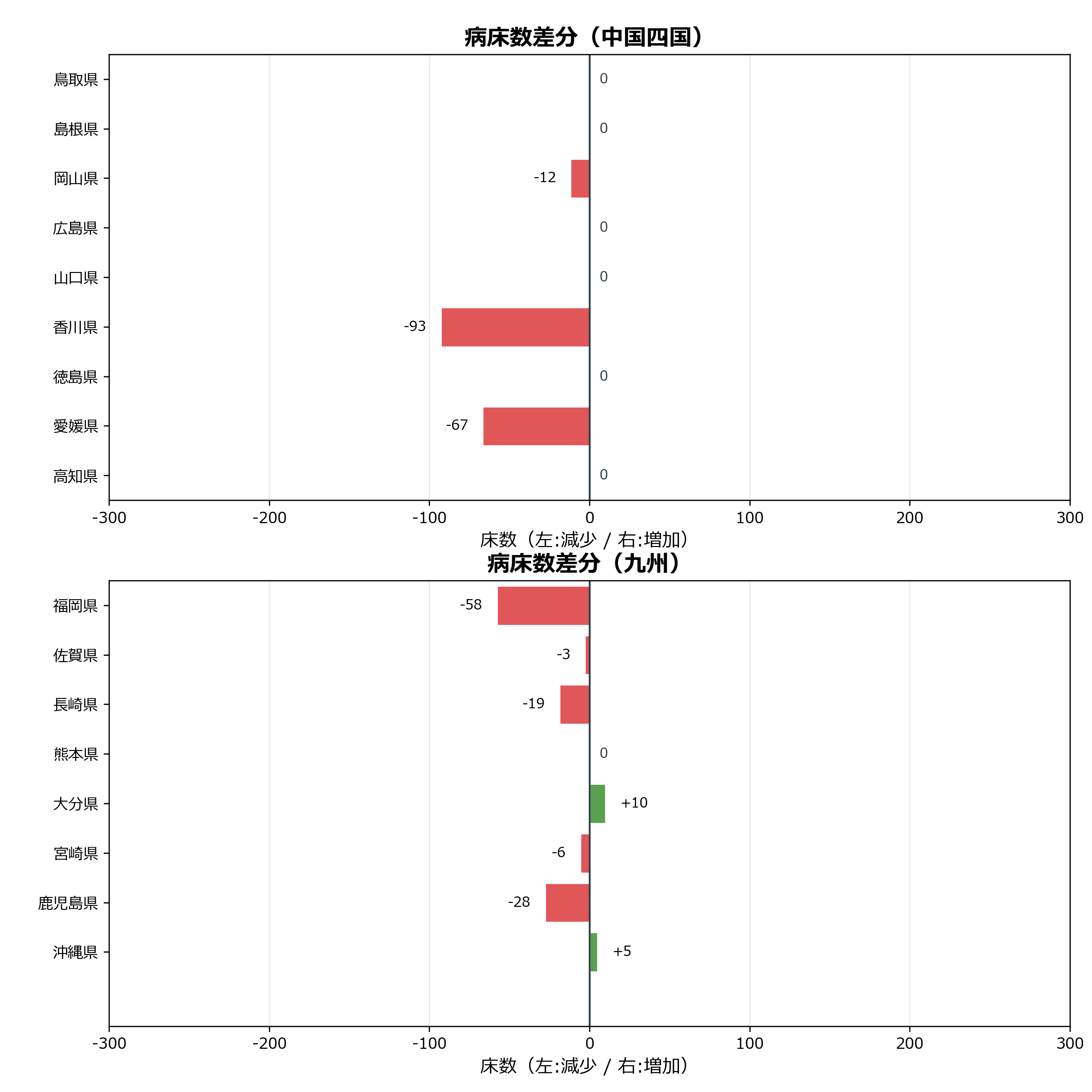 全国の病床数差分は-663床でした。 地域別では中国四国の変動幅が最も大きく、-172床で全体変動の24.1%を占めています(香川県-93床など)。次いで近畿(-127床)、北海道・東北(-127床)と続いています。