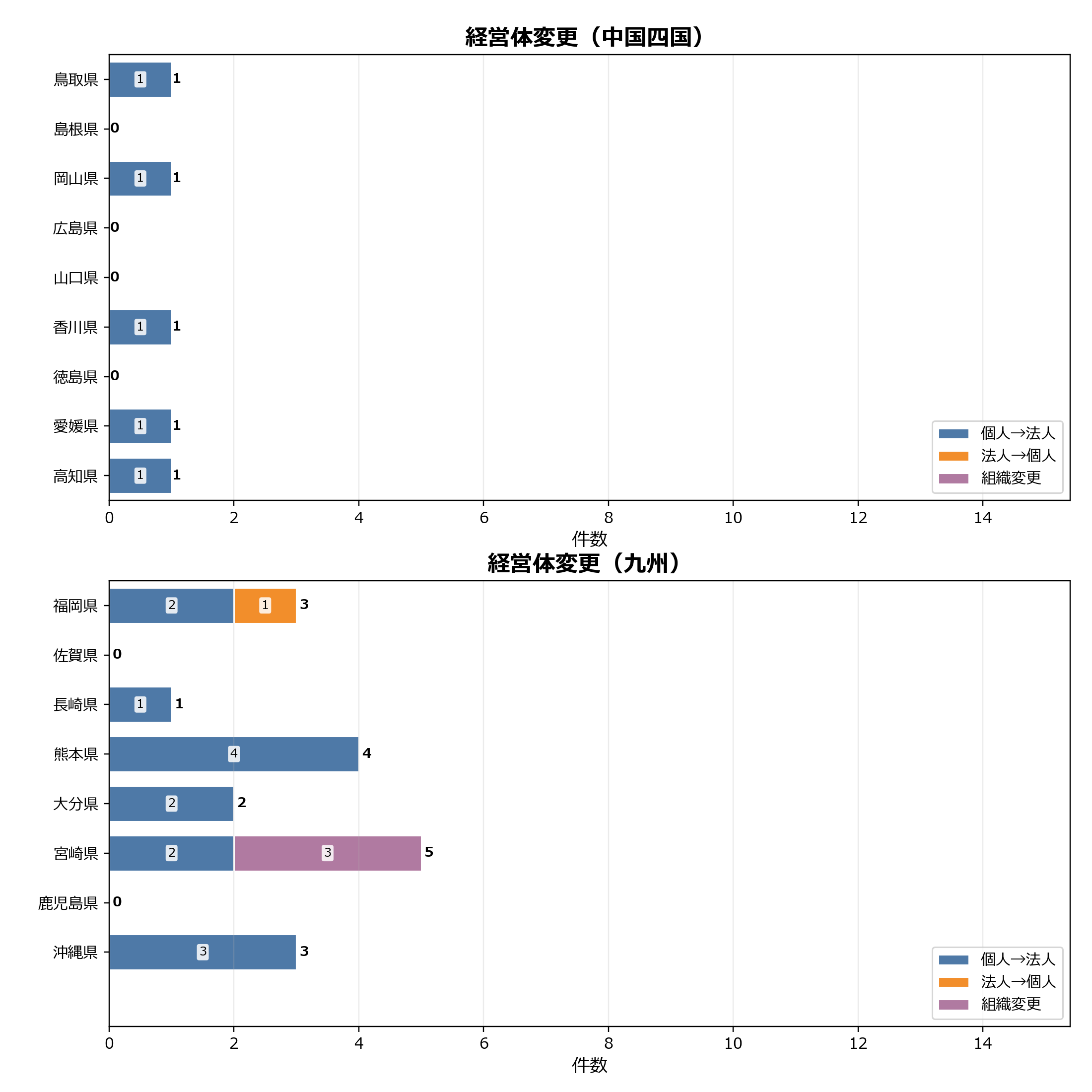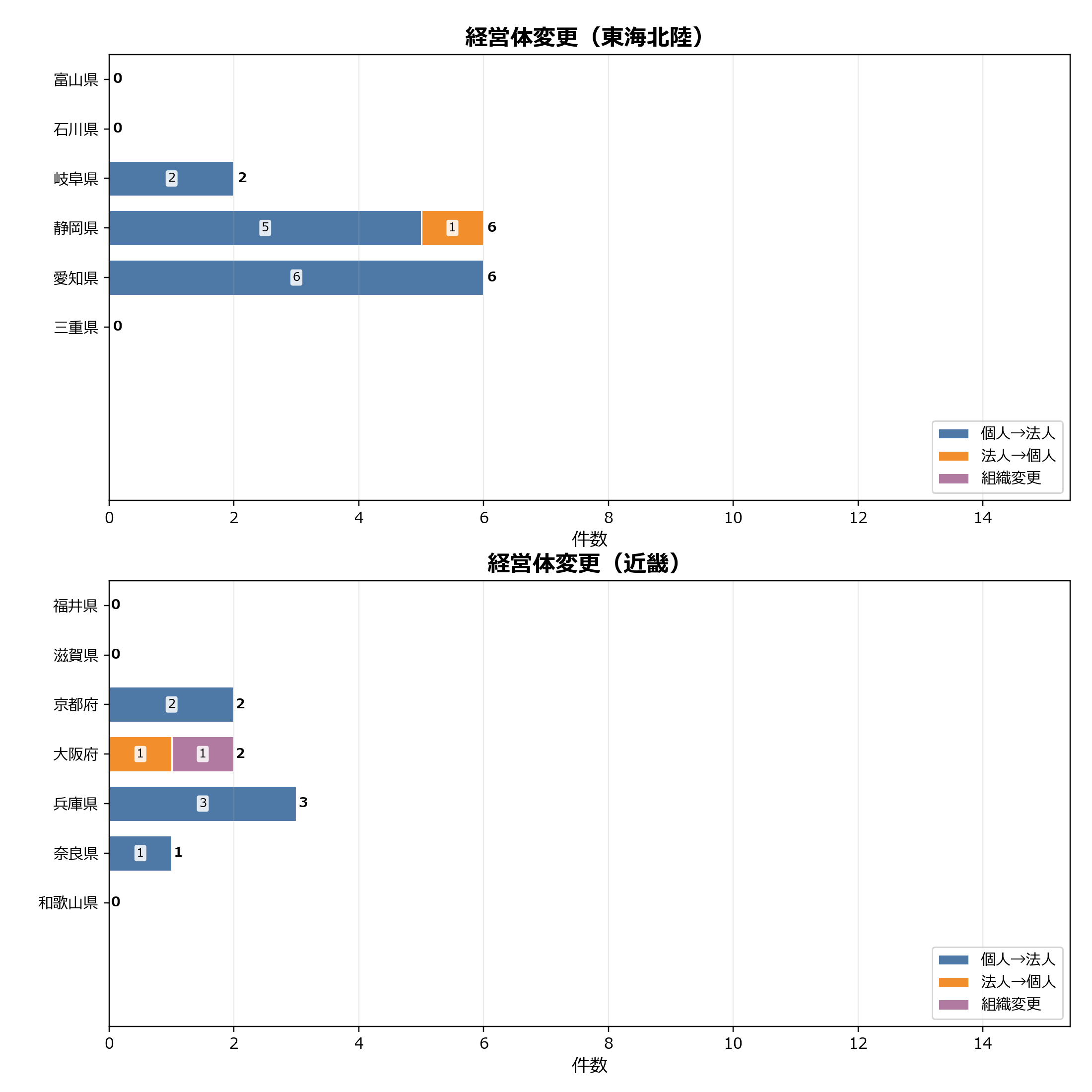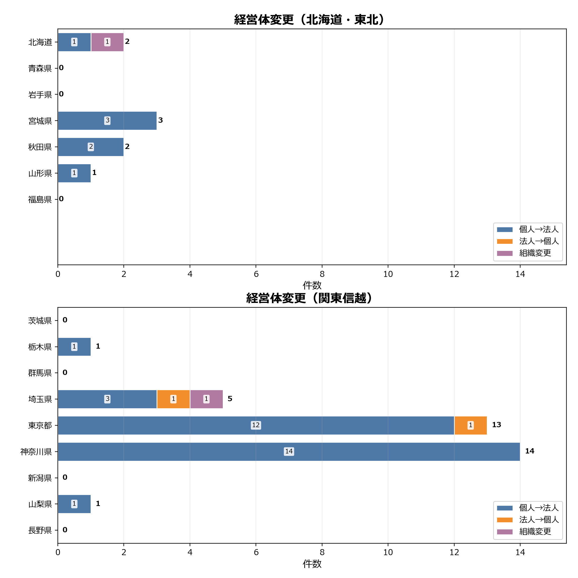 全国の経営体変更は合計94件でした。 地域別では関東信越が34件で最多で、全国の36.2%を占めています。地方内では神奈川県(14件)や東京都(13件)を中心に法人化などの動きが継続しています。