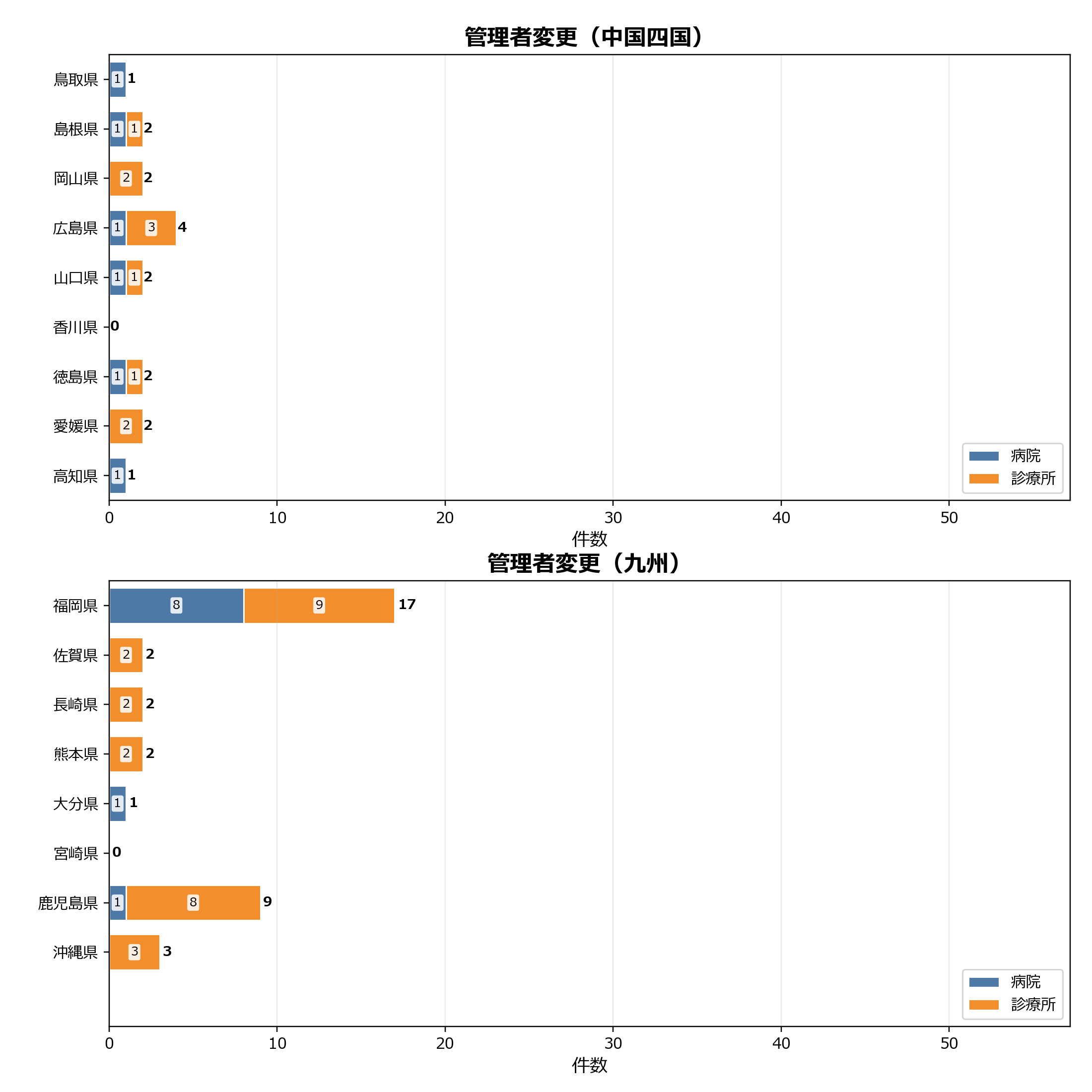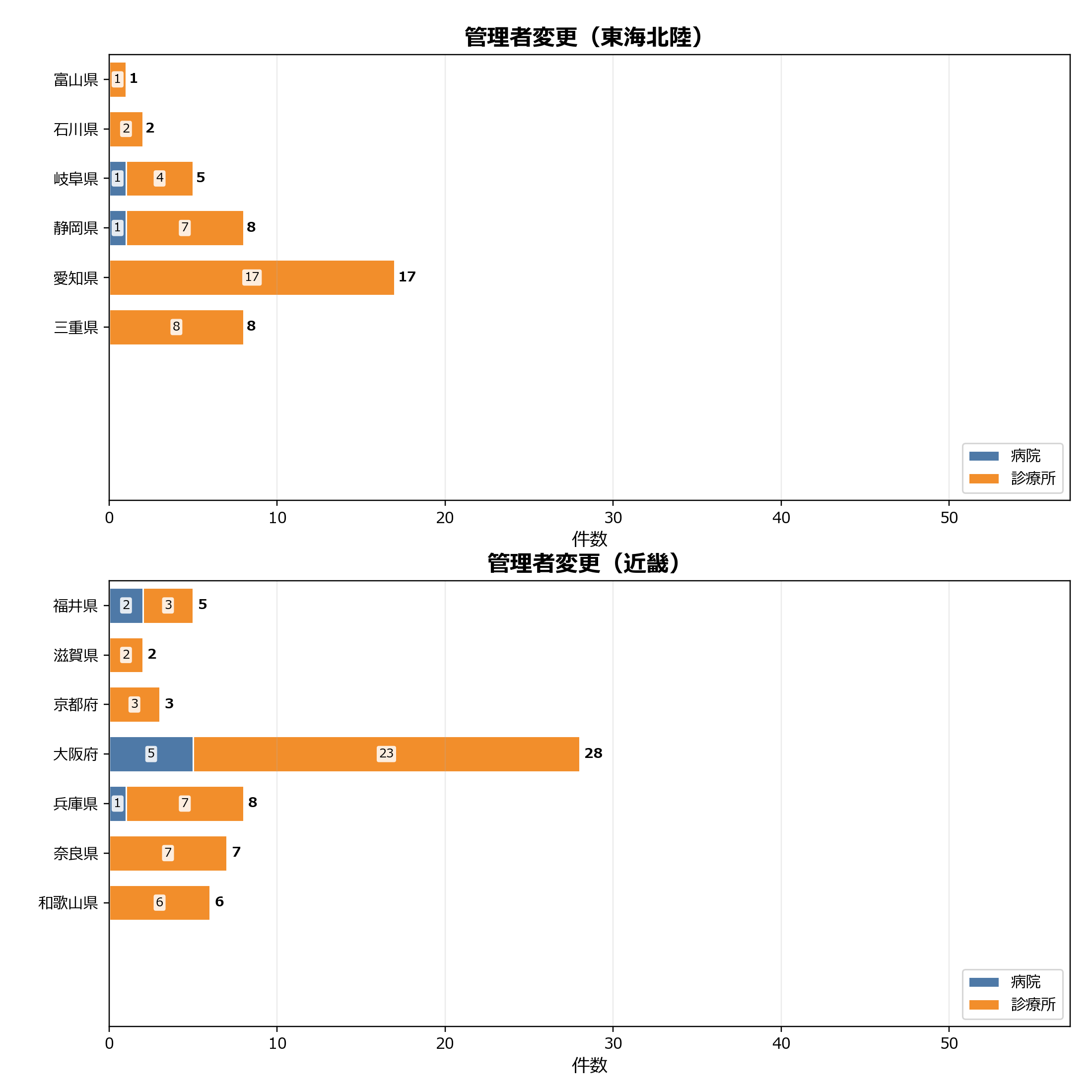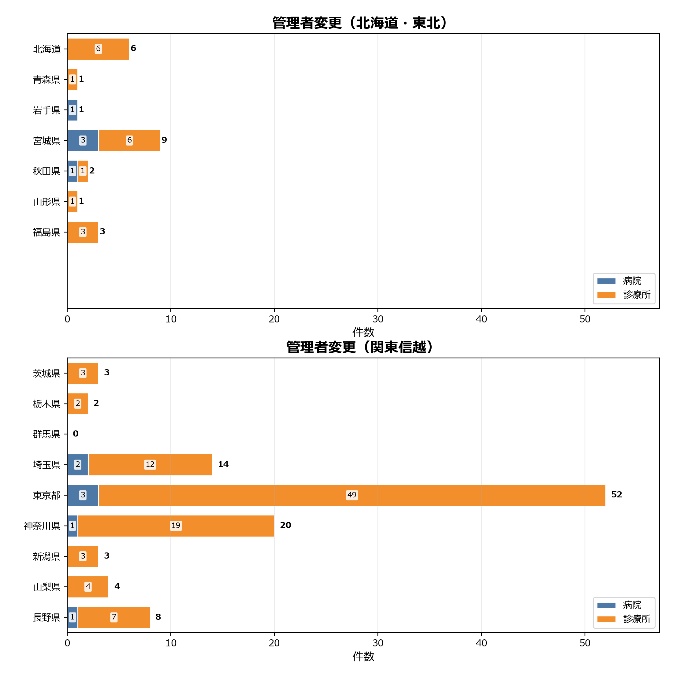 このグラフは、当月に管理者変更があった医療機関を都道府県別に整理したものです。病院と診療所の内訳をあわせて見ることで、地域ごとの変更件数の偏りや施設種別の違いを把握できます。