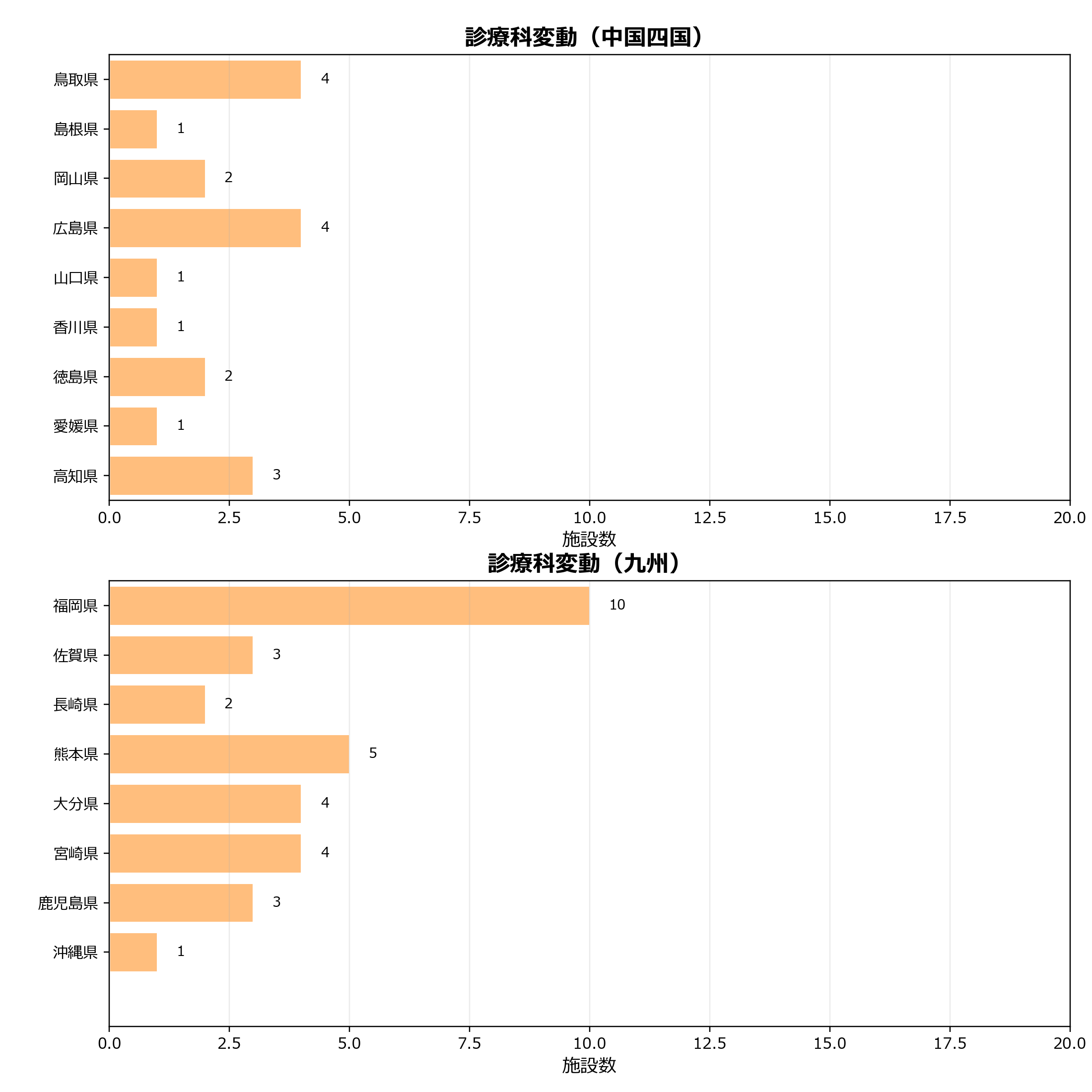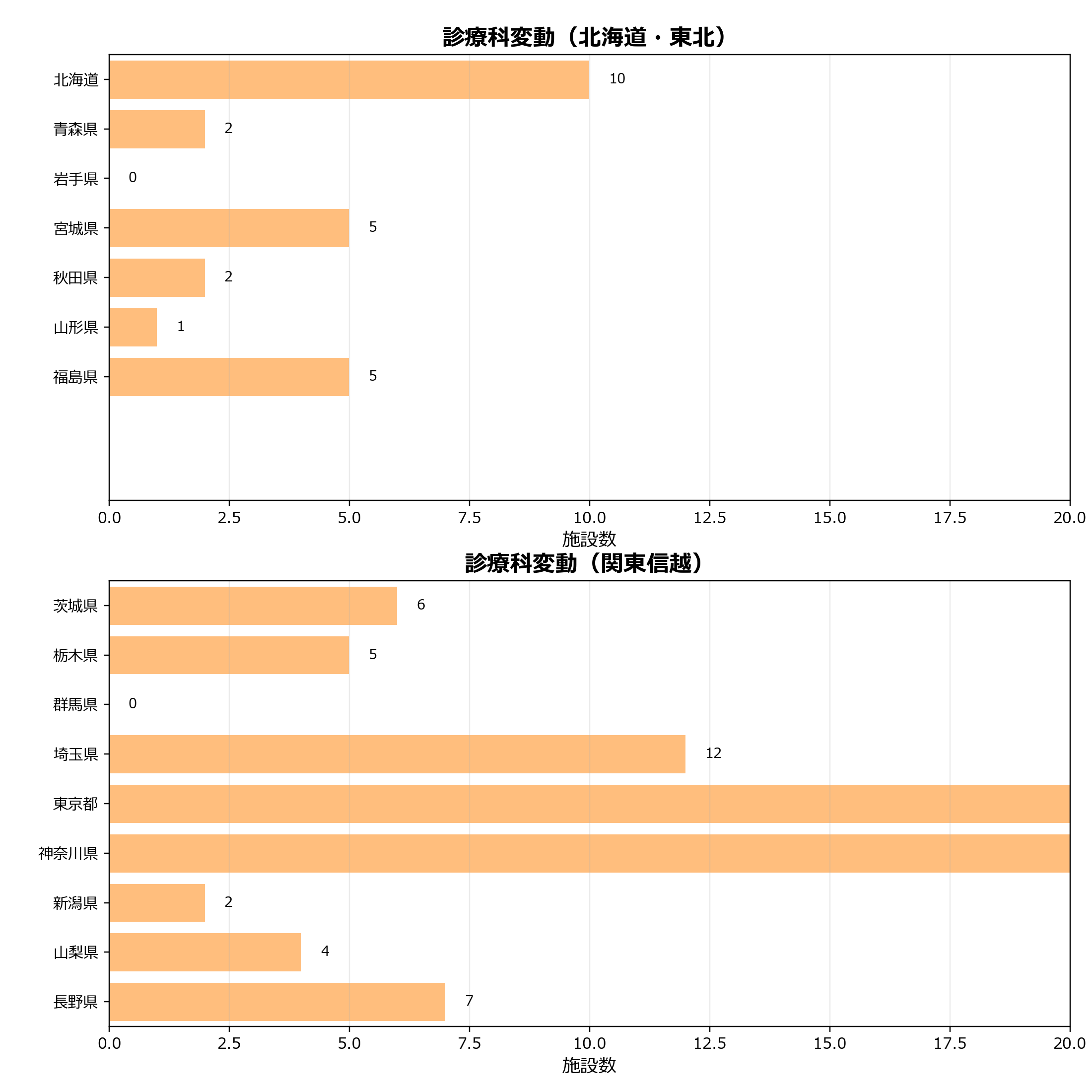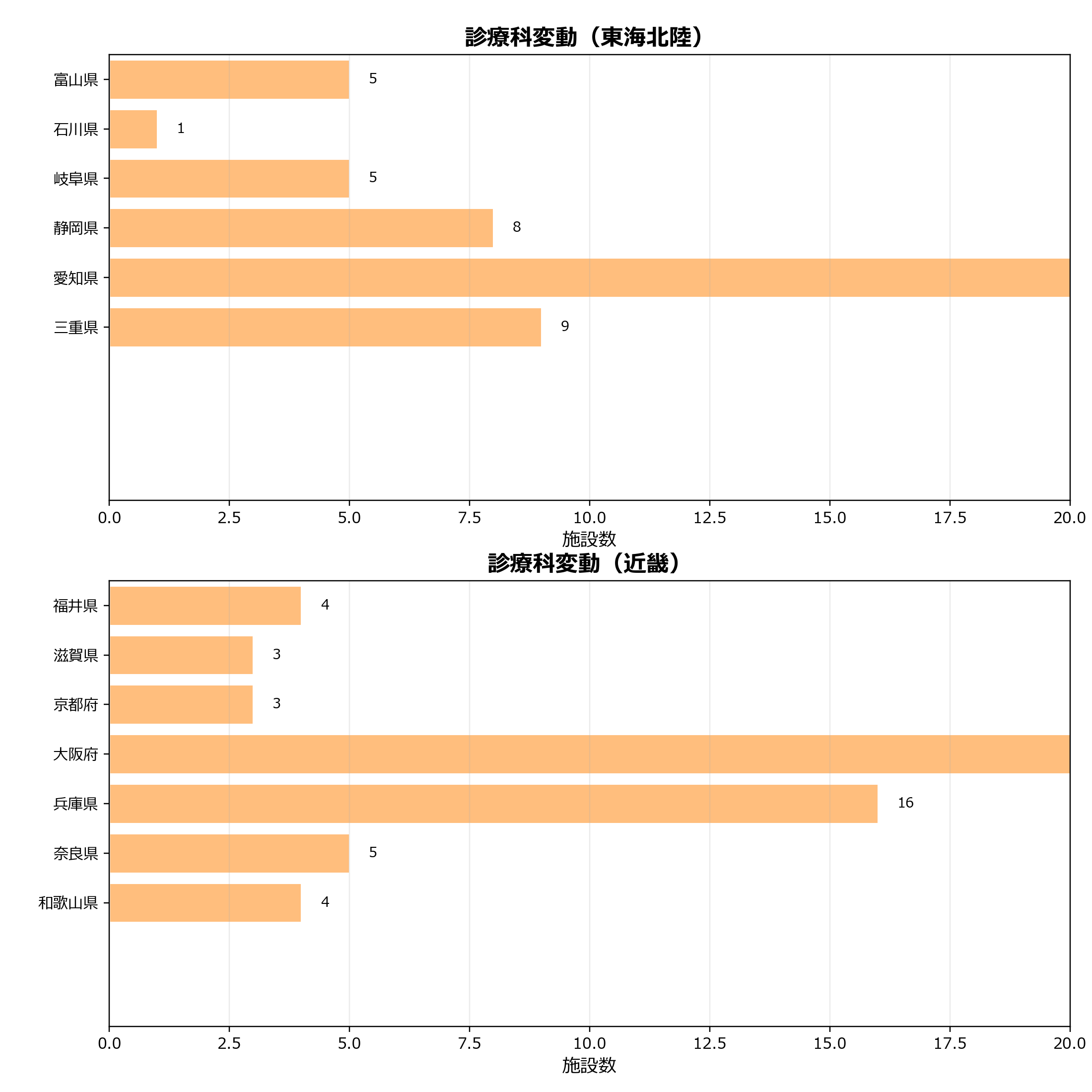 このグラフは、当月に追加または減少した診療科を整理したものです。診療科の領域別の変動や都道府県ごとの分布を見ることで、診療機能の見直しがどの領域・地域で起きているかを把握できます。