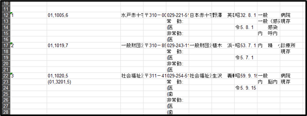 さらに、病院リストの中身はというと、可読性・加工性の悪さが際立ちます。実際に、EXCEL形式の病院リストを見てみましょう(図1)。