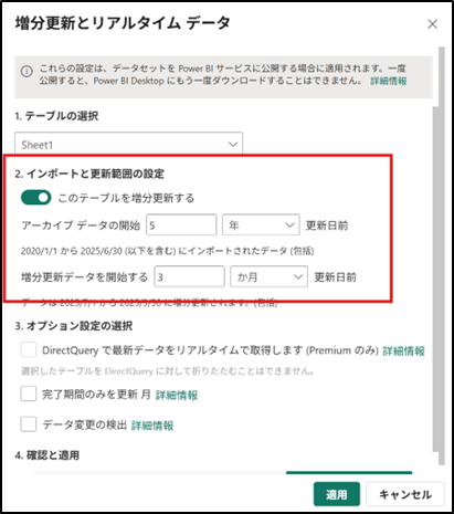 ※増分更新の設定自体は Power BI Desktopで可能ですが、実際に「直近○か月のみ更新される」などの動作が有効になるのは Power BIサービスに発行し、スケジュール更新を実行した場合です。