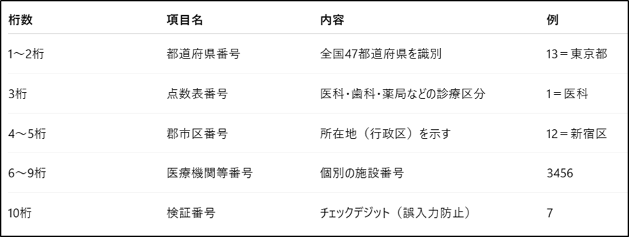 医療機関コードは 10桁 の数字で構成され、それぞれの桁に意味があります。