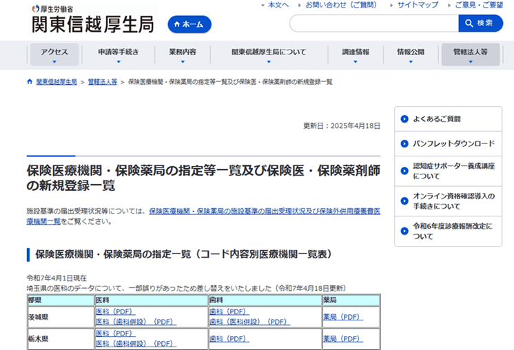 保険医療機関や保険薬局の情報は、厚生労働省の地方支分部局である「地方厚生局」の公式サイトで公開されています。各地方厚生局では「コード内容別医療機関一覧表」として、都道府県ごと・診療区分ごとにファイルを提供しています。
