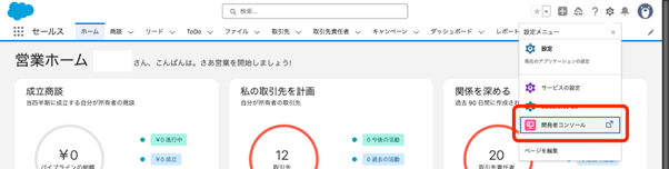 Lightning の歯車アイコン(設定)→ 開発者コンソールをクリック。