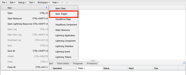 メニュー File > New > Apex Trigger を選び、対象オブジェクトを選択して作成します。トリガはレコードの挿入・更新・削除などの前後で動くフックです。