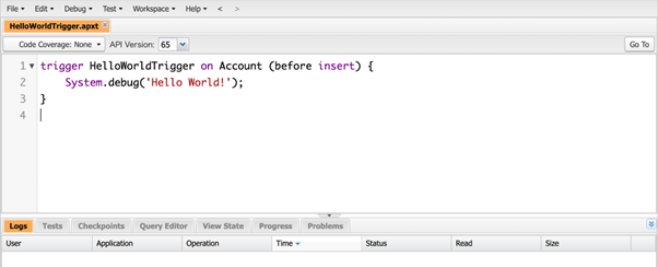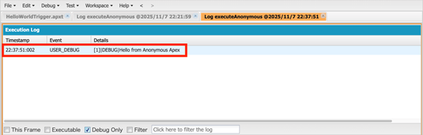 作成したトリガは取引先を新規作成した際に、”Hello World!”というデバッグを残すというトリガになっています。