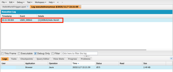 (Execute Anonymousによるデバッグを確認している画面)