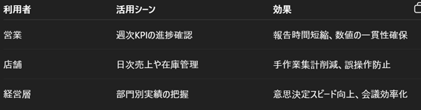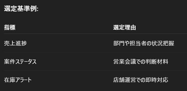 - 意思決定のスピード向上: 経営層やマネージャーが必要なKPIを即座に確認