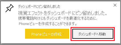 - [ピン留め] を選択すると、現在のワークスペースに新しいダッシュボードが作成される。 [ダッシュボードにピン留めしました] というメッセージが表示されたら、 [ダッシュボードに移動] を選択。 レポートの保存を求めるメッセージが表示されたら、[保存] を選択する。