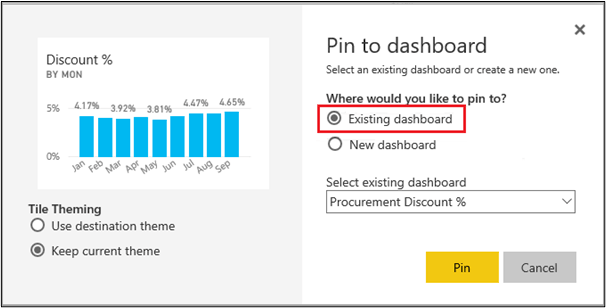 - 新しいダッシュボードにさらにいくつかタイルをピン留めする。 [ダッシュボードにピン留めする] ウィンドウが表示されたら、 [既存のダッシュボード] を選択。