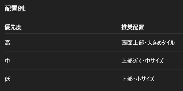 - 良い例: 重要指標を強調、関連タイルをグループ化