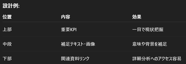 重要指標を上部に配置し、関連資料や詳細分析へのリンクを下部にまとめることで、全体像と詳細をスムーズに行き来できる構成になります。