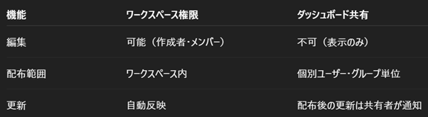 ワークスペース権限は作業用環境として使い、ダッシュボード共有は閲覧用配布として使い分けるのがポイントです。