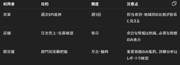 ダッシュボードは、利用者と目的に合わせて設計します。「誰が見るか」「どの指標を把握したいか」「どの頻度で確認するか」を整理しましょう。
