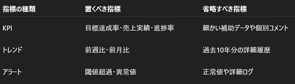 ダッシュボードは概要把握が目的のため、情報を詰め込みすぎないことが重要です。