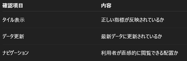 ダッシュボードの視認性はタイルのサイズや配置で大きく変わります。重要指標を目立たせ、関連指標を近くに配置すると理解しやすくなります。