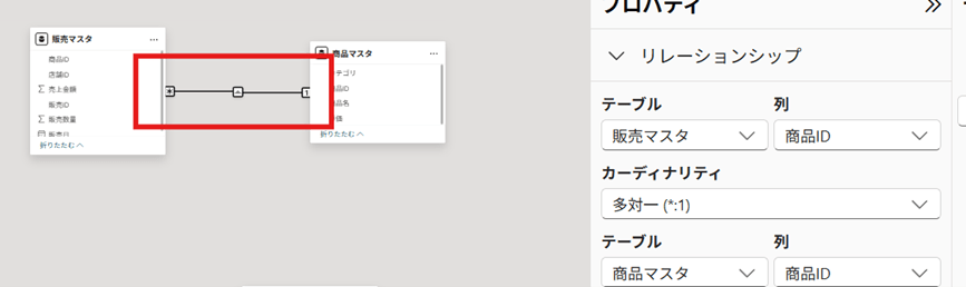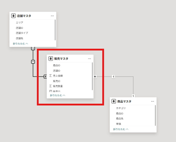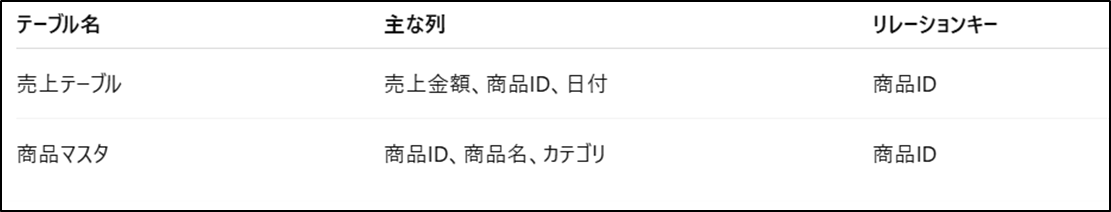 たとえば、以下のように「売上テーブル」と「商品マスタ」を「商品ID」で結ぶと、