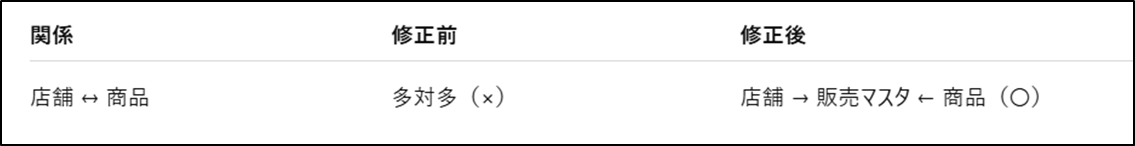 💡 例:「店舗×商品」のような多対多の関係では、「販売マスタ」を中間に配置します。