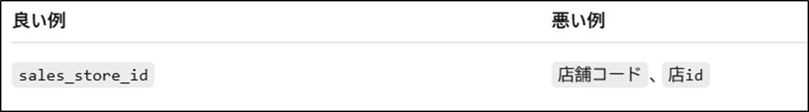 命名ルールを統一し、「テーブル名_項目名」(例:sales_store_id)のようにルール化すると管理しやすくなります。